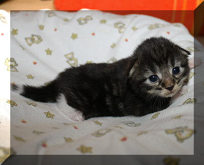 Mit zwei Wochen hat sich Berit toll entwickelt. Sie hat nicht nur eine weiße Schwanzspitze, sondern sogar eine schwarz-weiße, das gibt es sicher auch nicht oft.