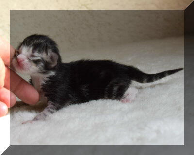 Mit fast zwei Wochen ist Efie die einzige etwas zartere Maus des ganzen Wurfes. Sie ist quietschfidel, sieht aber ein bisschen wie die kleine Schwester aus. Sie hatte mit knapp 100 g auch mit Abstand das geringste Geburtsgewicht. |